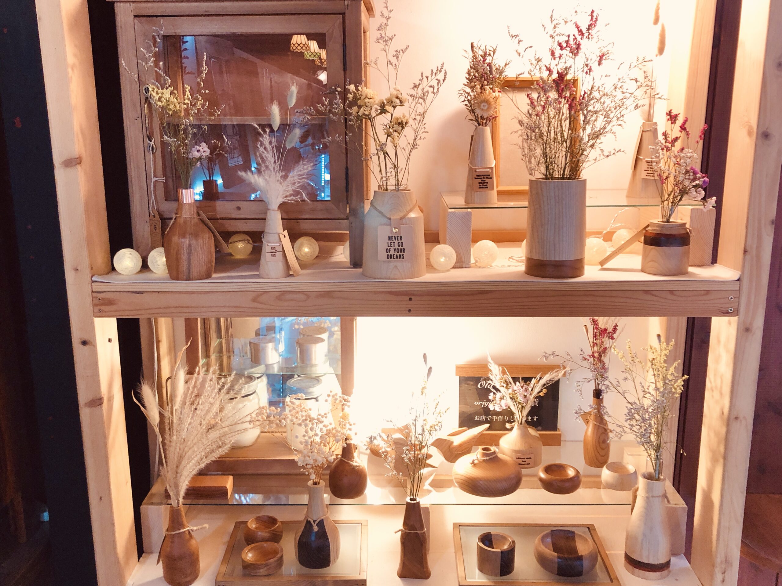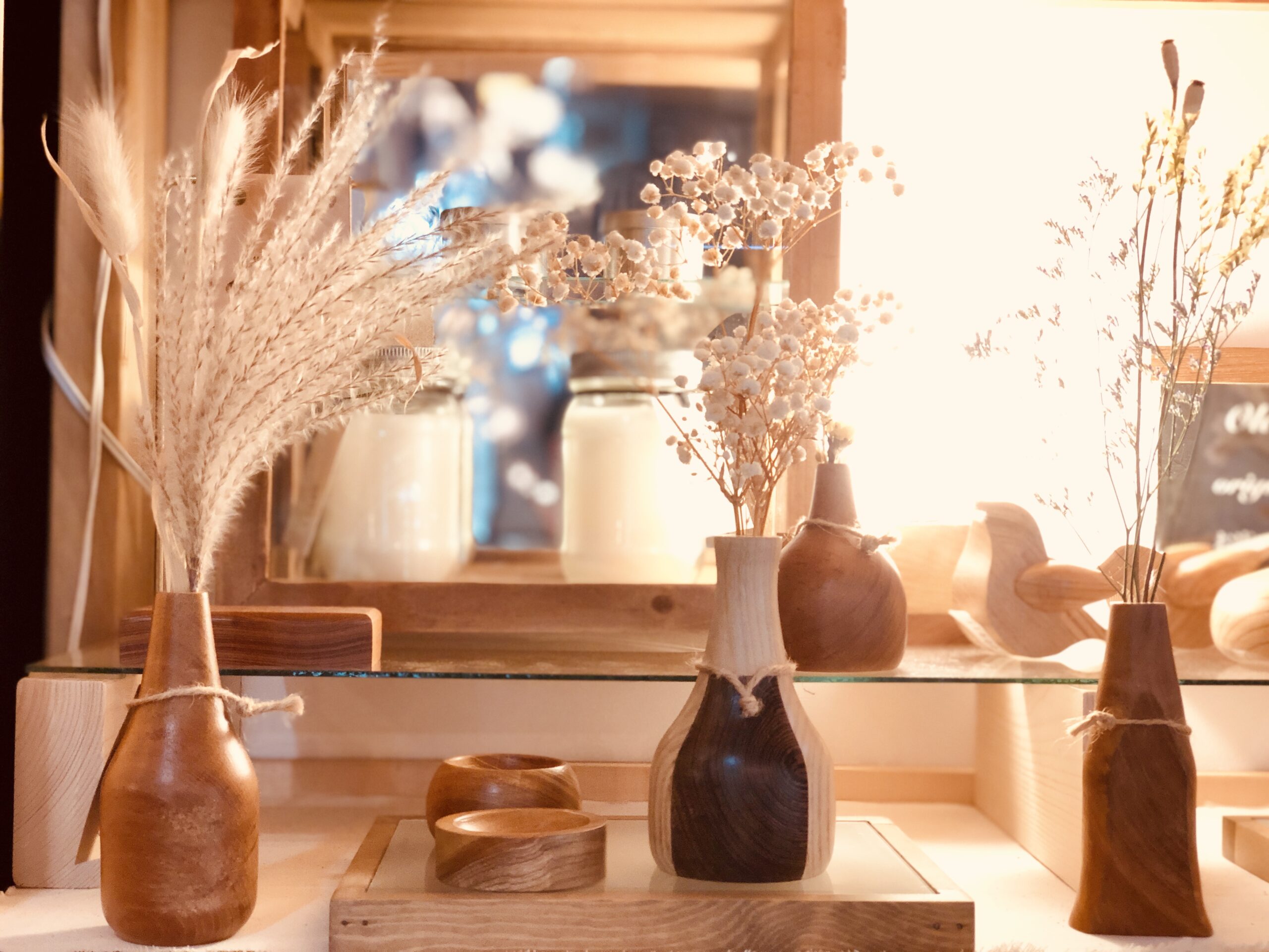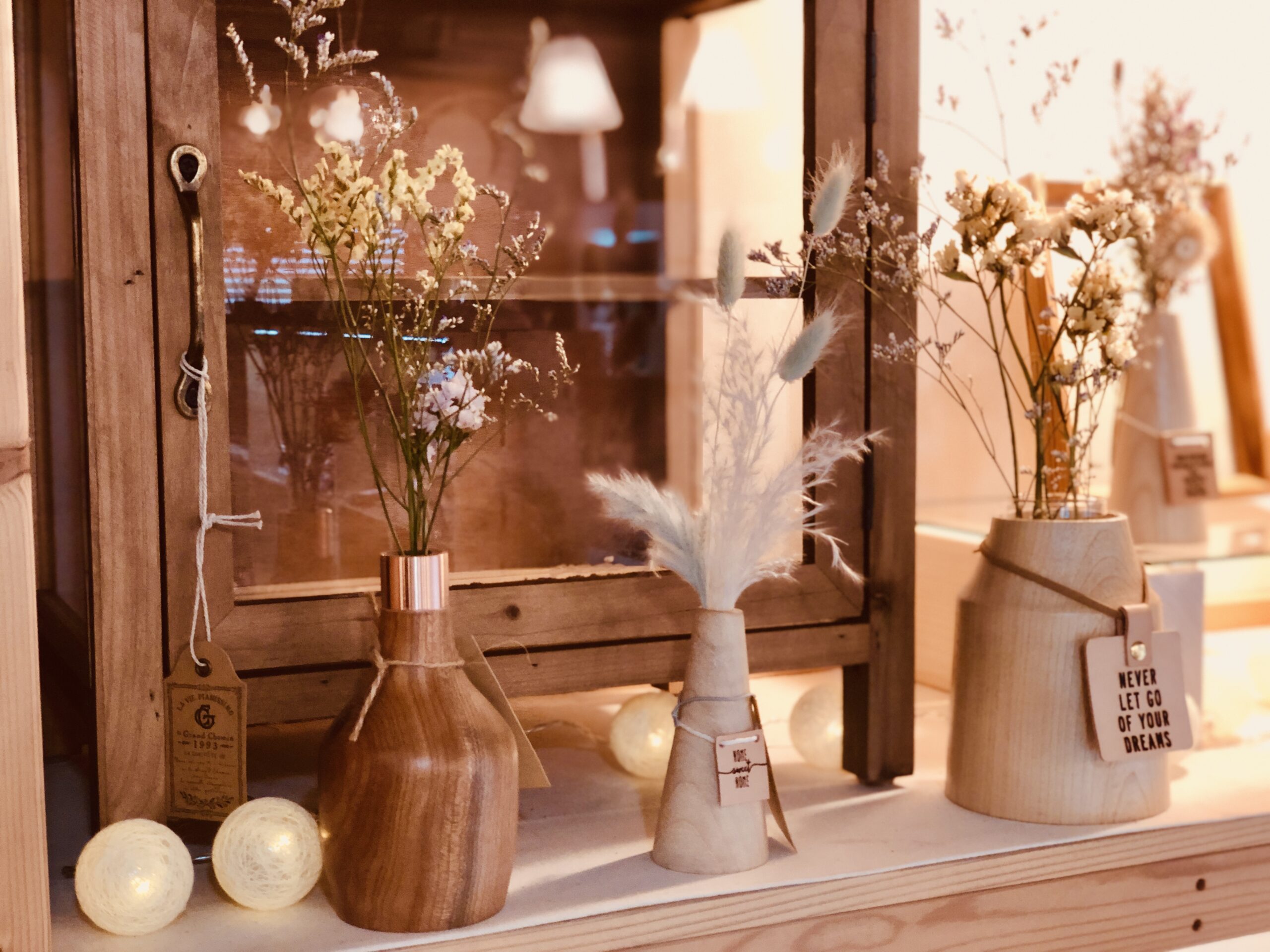 お気に入りのドライフラワーをウッドフラワーベースにディスプレイして、