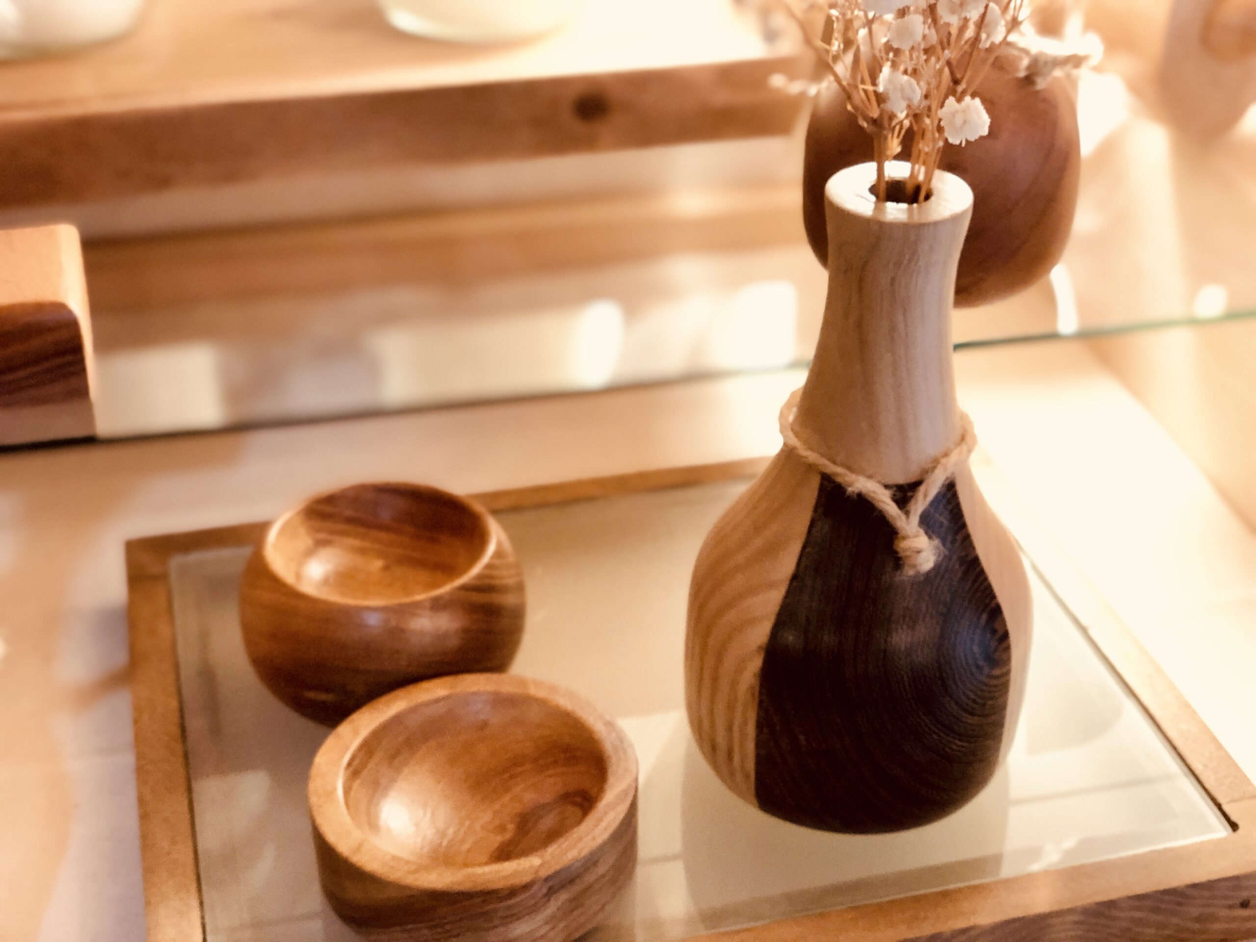 ・色の違う木を組み合わせた寄木のフラワーベースとアクセサリートレイ。