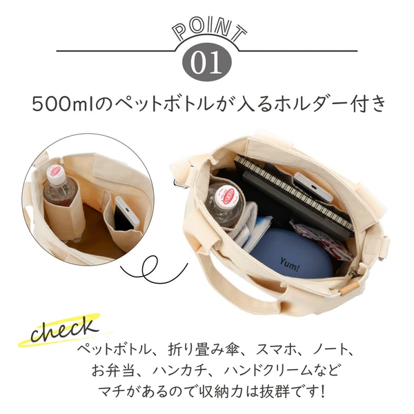 内側にはボトルホルダーがあるのでペットボトルやマイボトルなど、倒さずに収納できます。