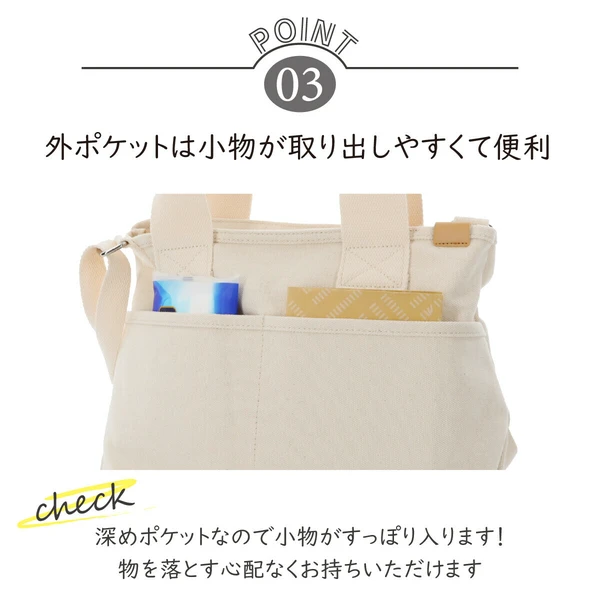 深めの外ポケットは、落とす心配なくサッと小物を入れられて、