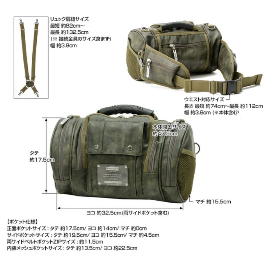 リュック肩紐サイズ : 最短 約82cmから最長 約132.5cm(※ 接続金具のサイズ含まず)/ 幅 約3.8cm