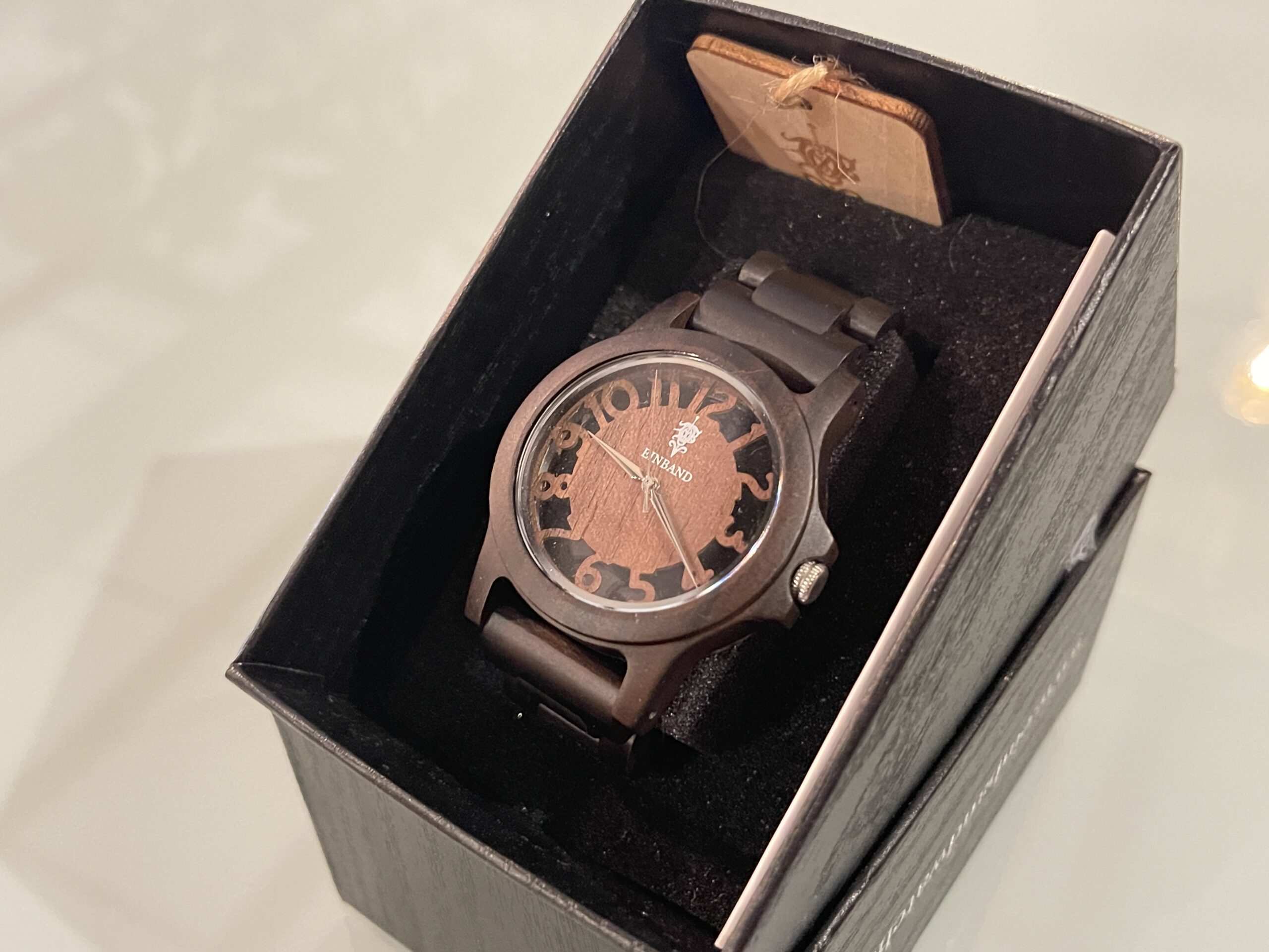 裏蓋がガラスになっていますの金属アレルギーにも優しい木製腕時計となります。