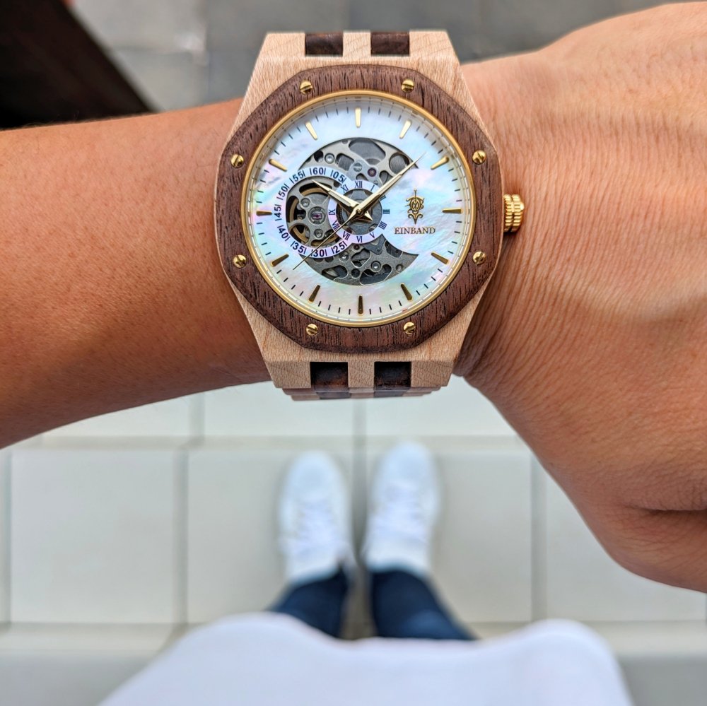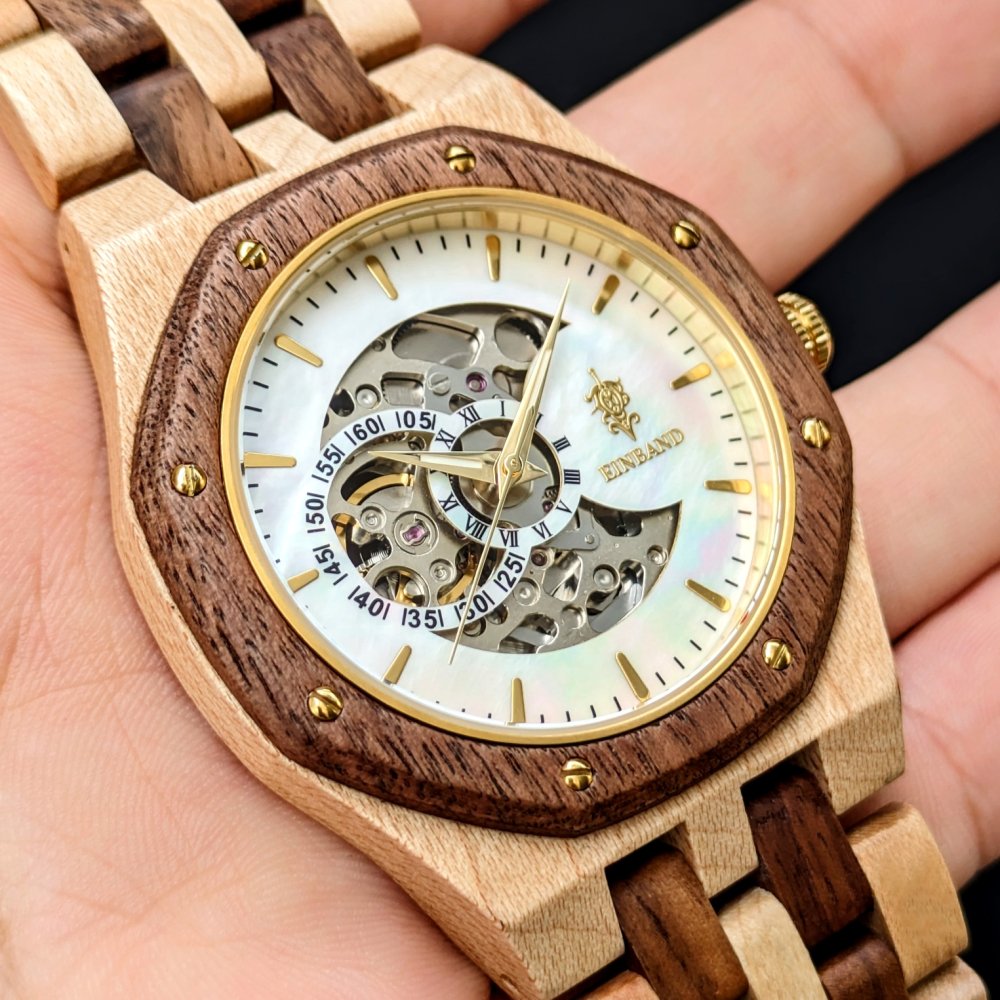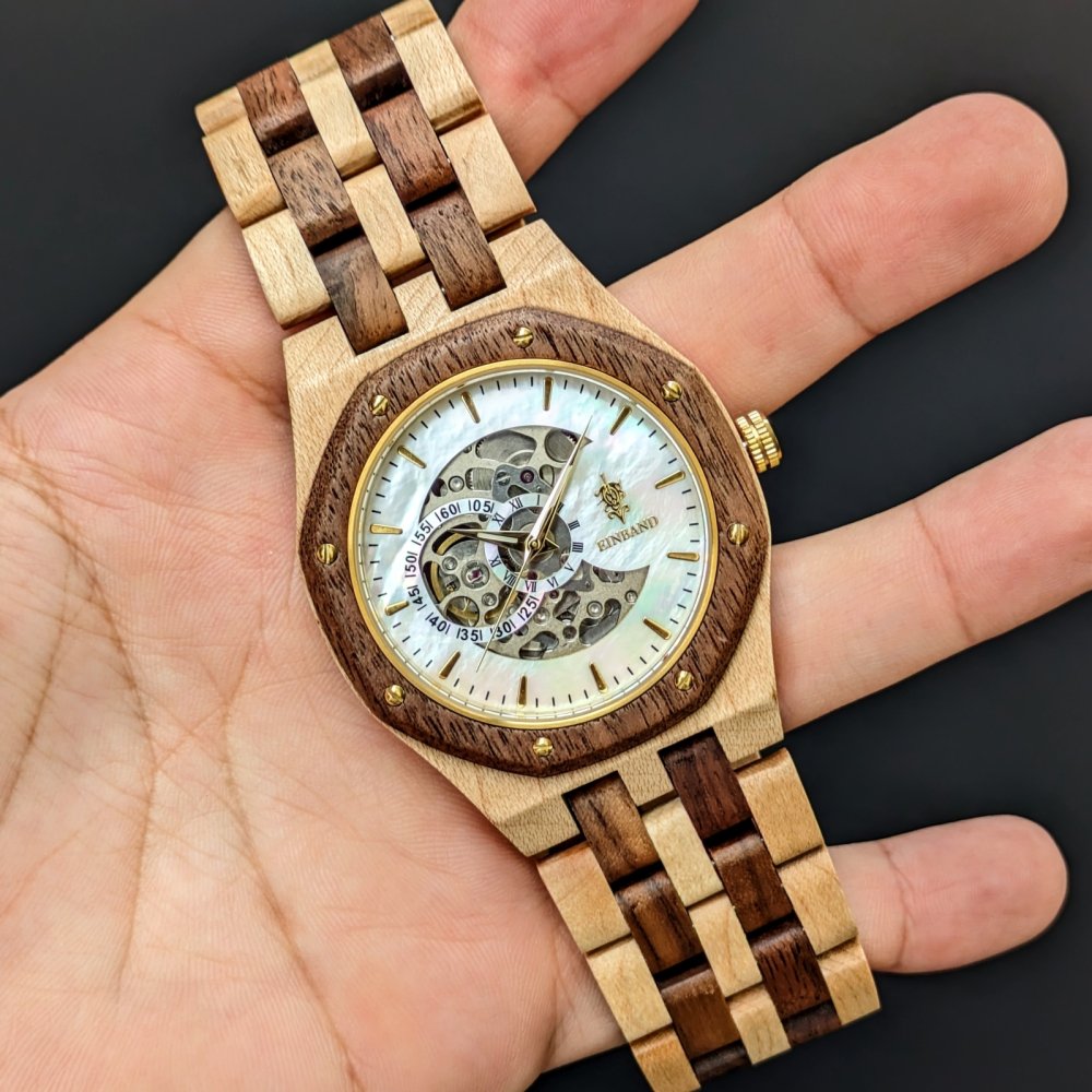 EINBAND Meteor 自動巻き木製腕時計 クルミ & メイプル マザーオブパール文字盤 46mm
