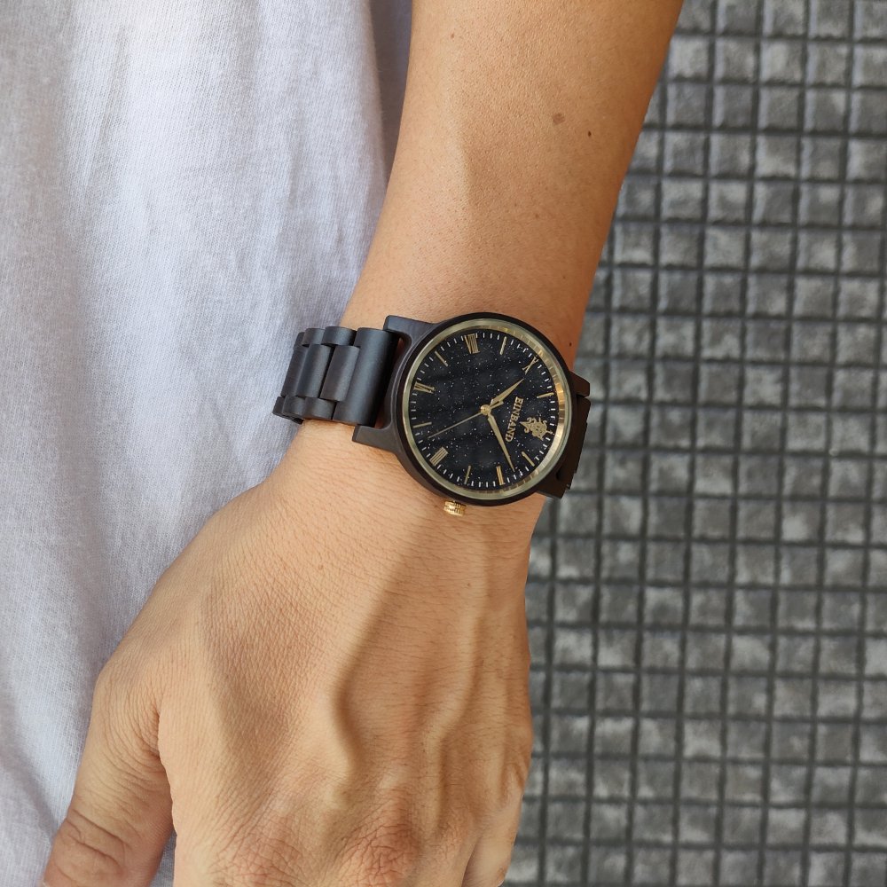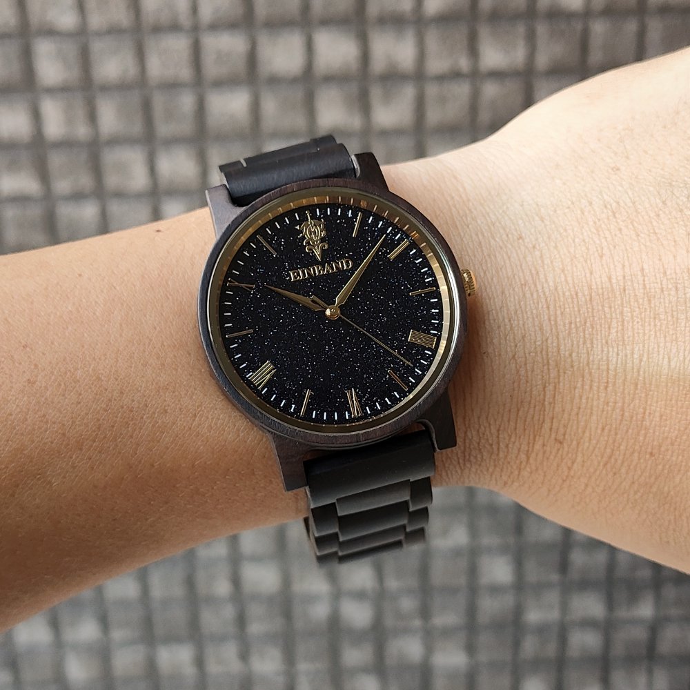 夜空の星のように輝くストーン『ブルーサンドストーン』を薄く切って文字盤にした木製腕時計です。