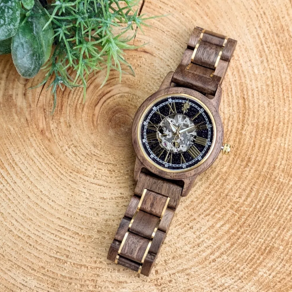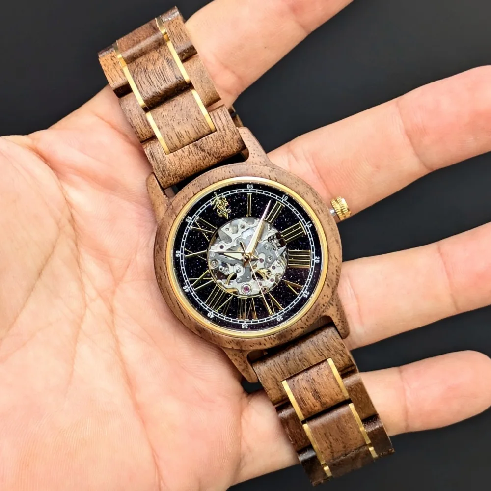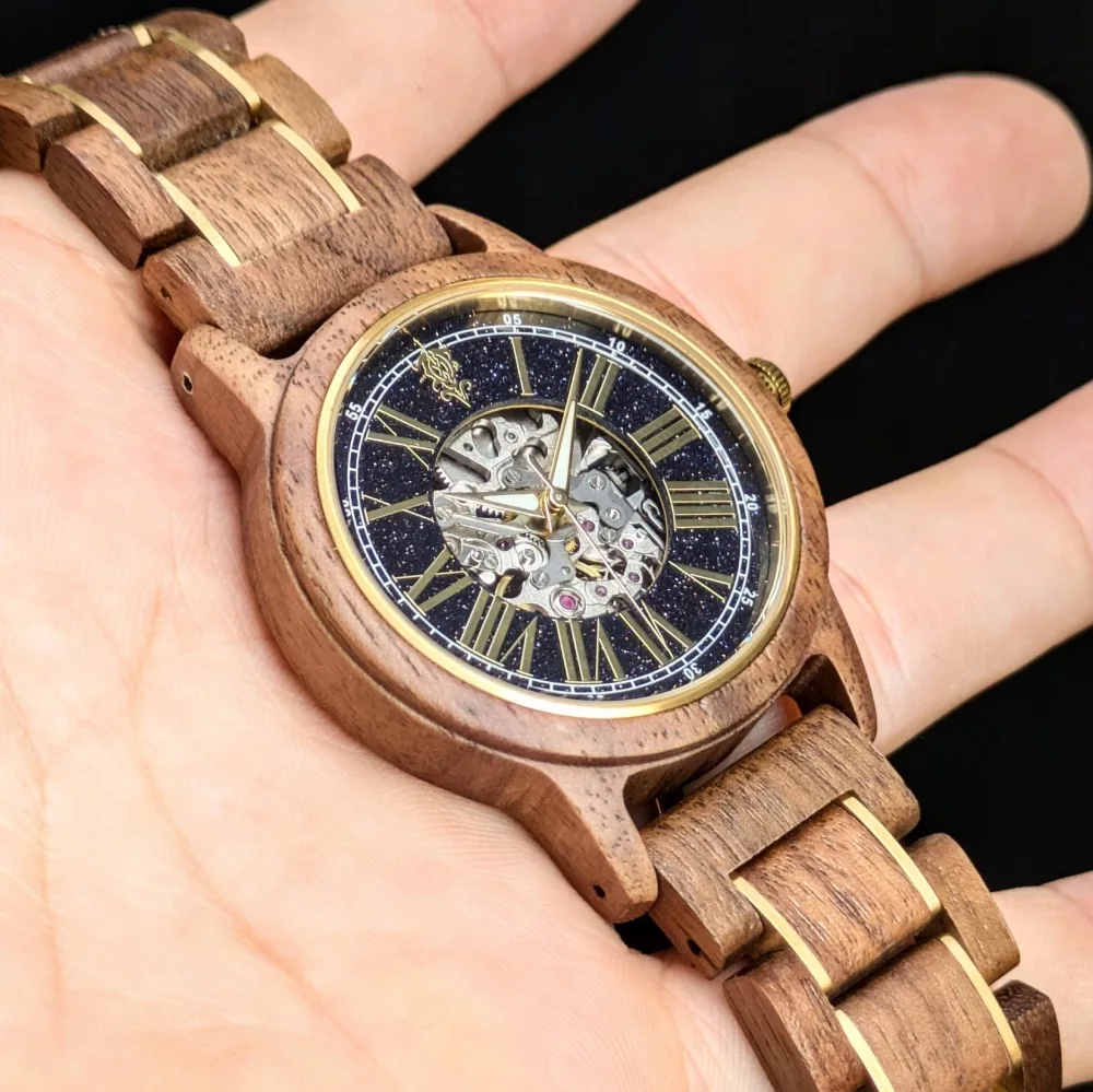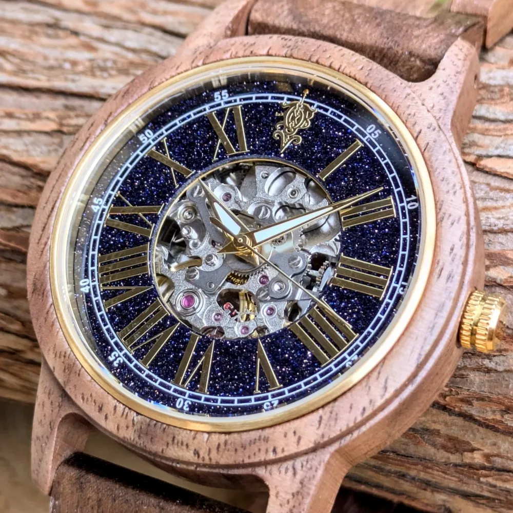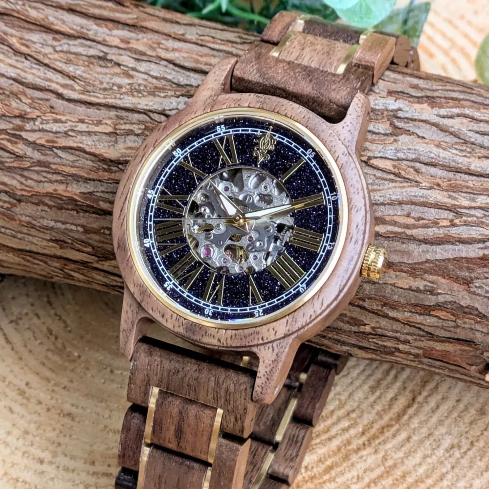 Frieden ブルーサンドストーン文字盤 クルミ×ゴールドベルト 自動巻き木製腕時計 40mm