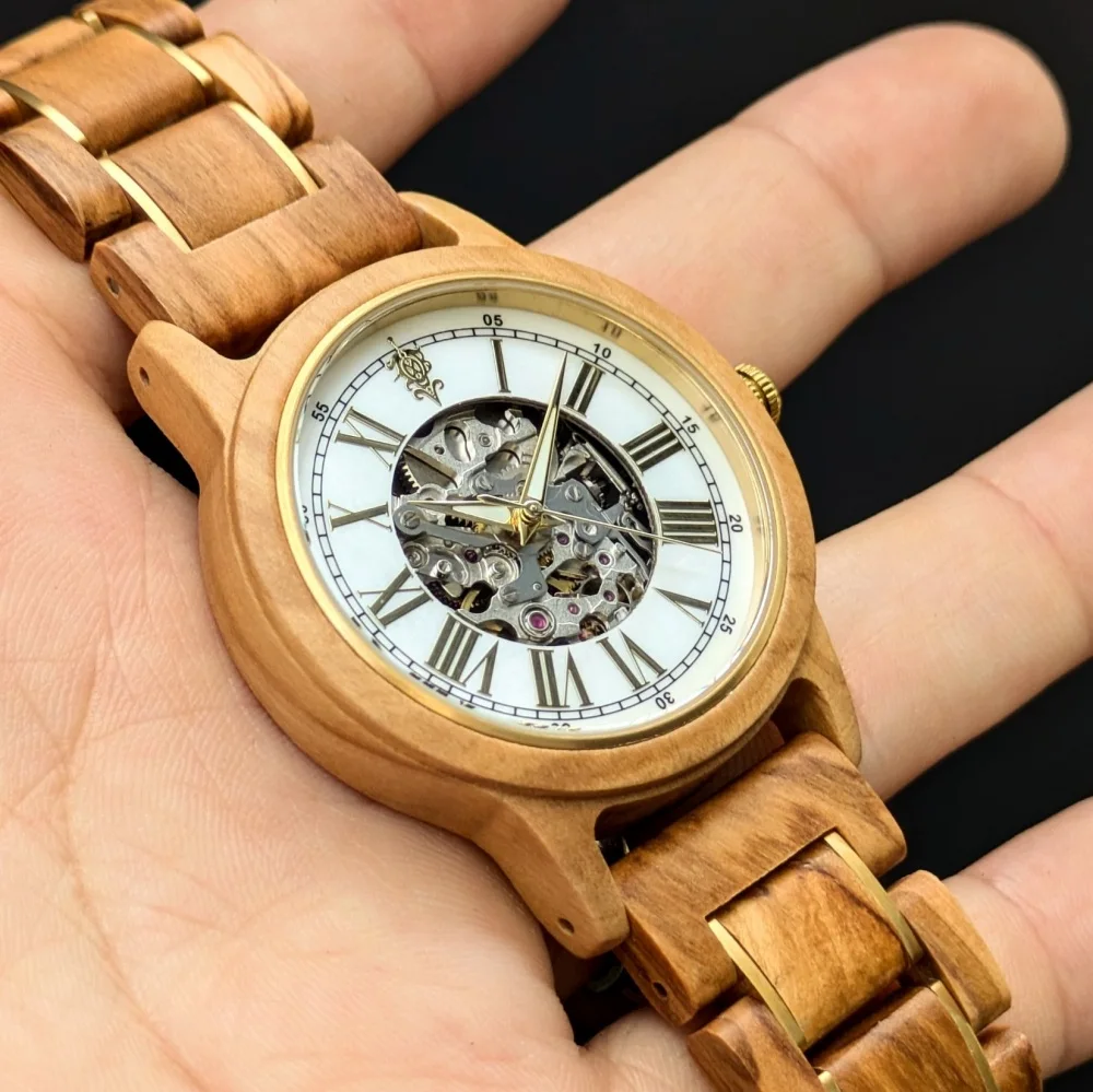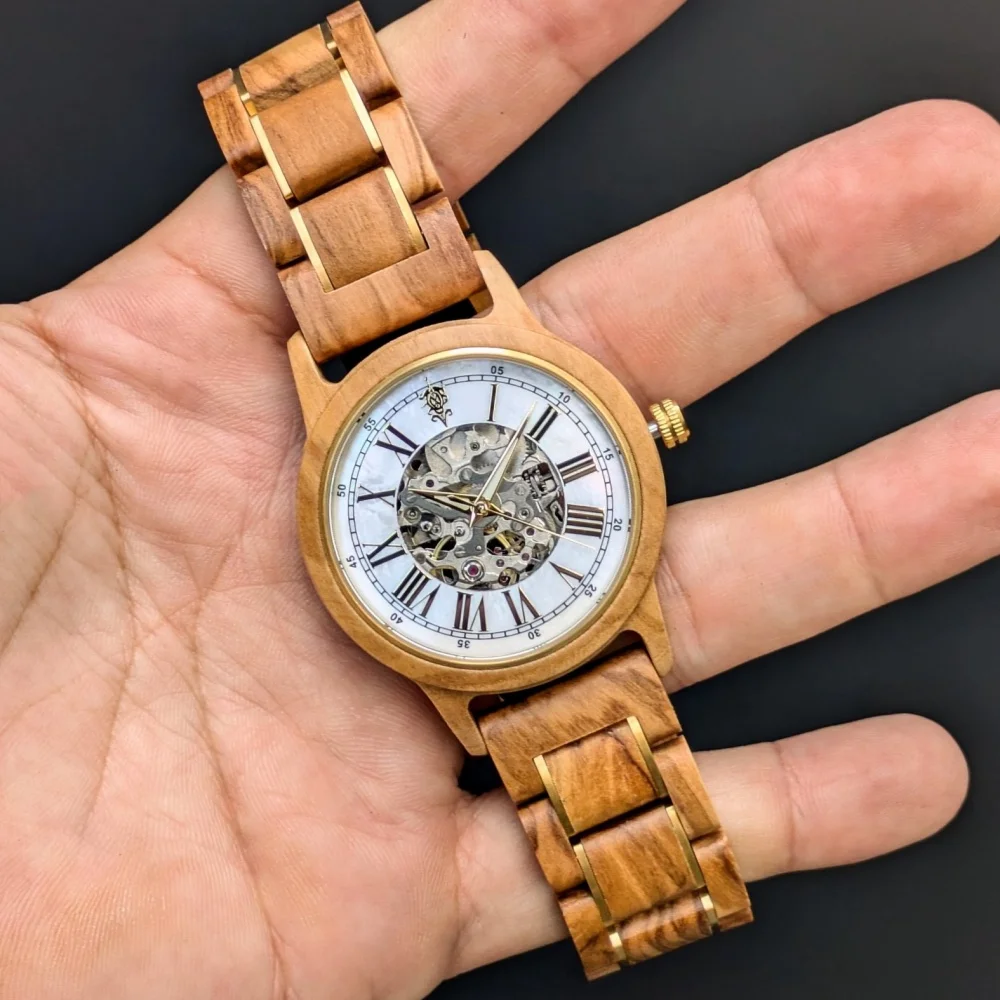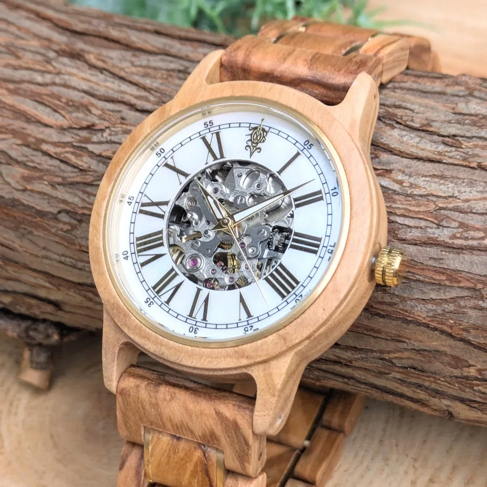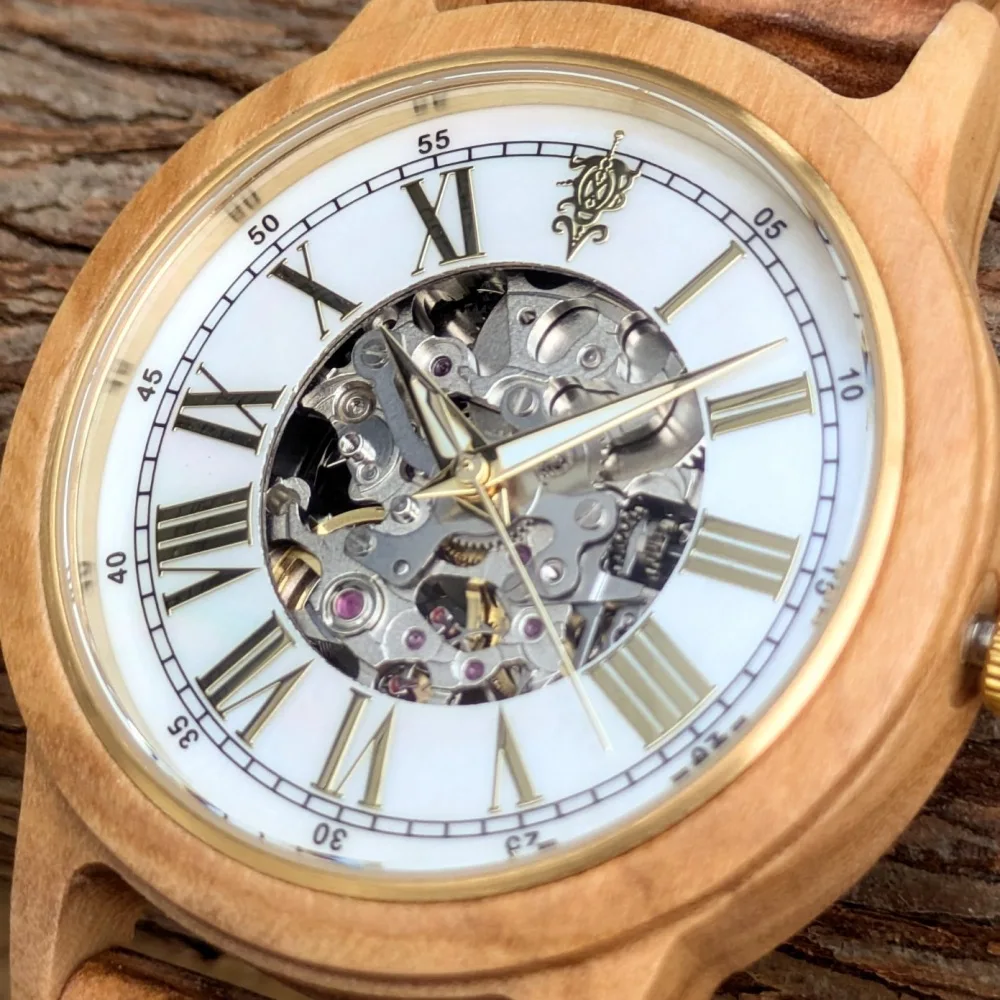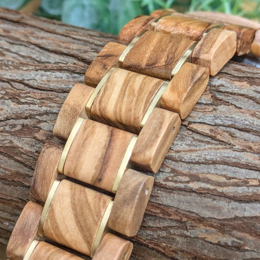 Frieden マザーオブパール文字盤 オリーブ×ゴールドベルト 自動巻き木製腕時計 40mm