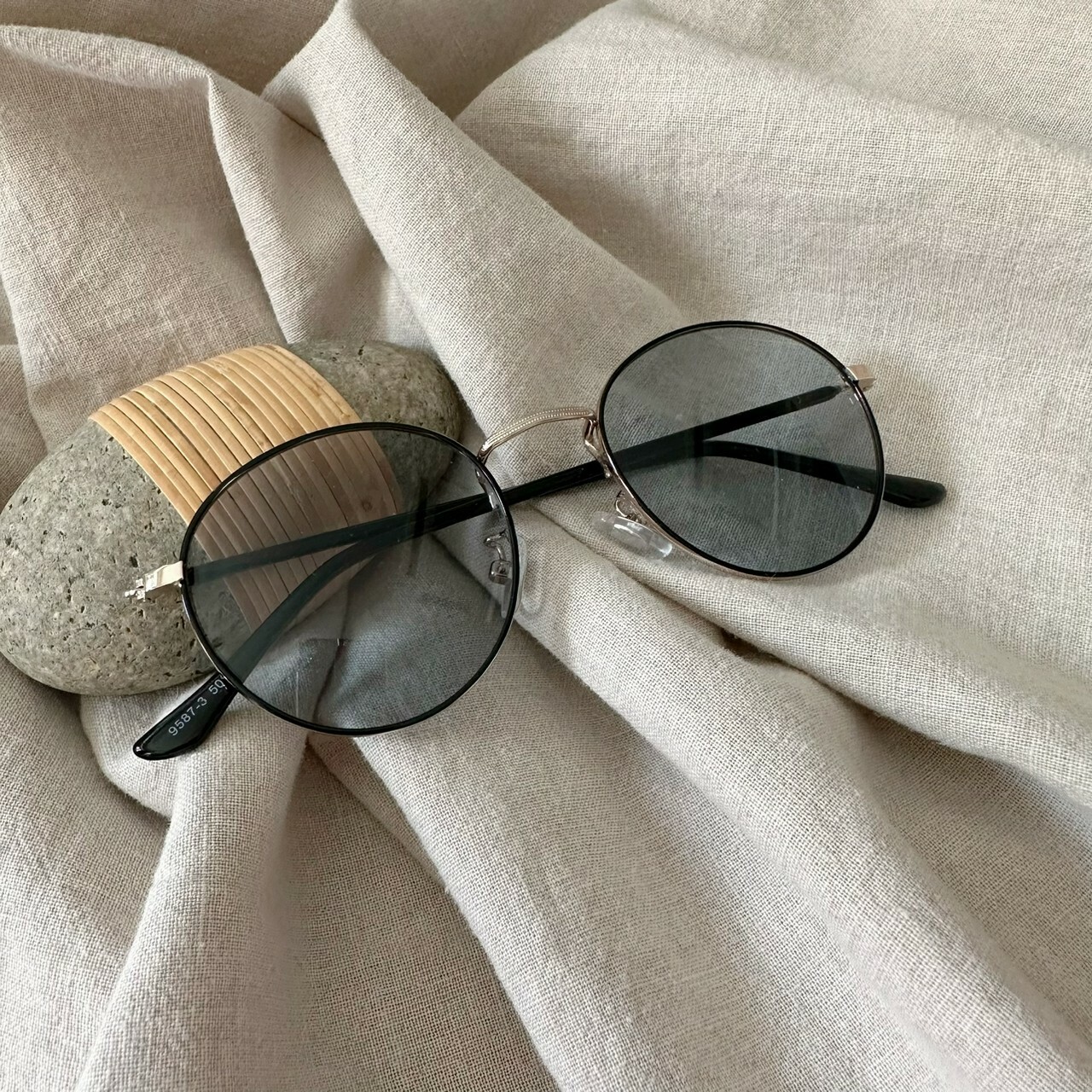 スモークがかったレンズが特徴的なラウンド型サングラス