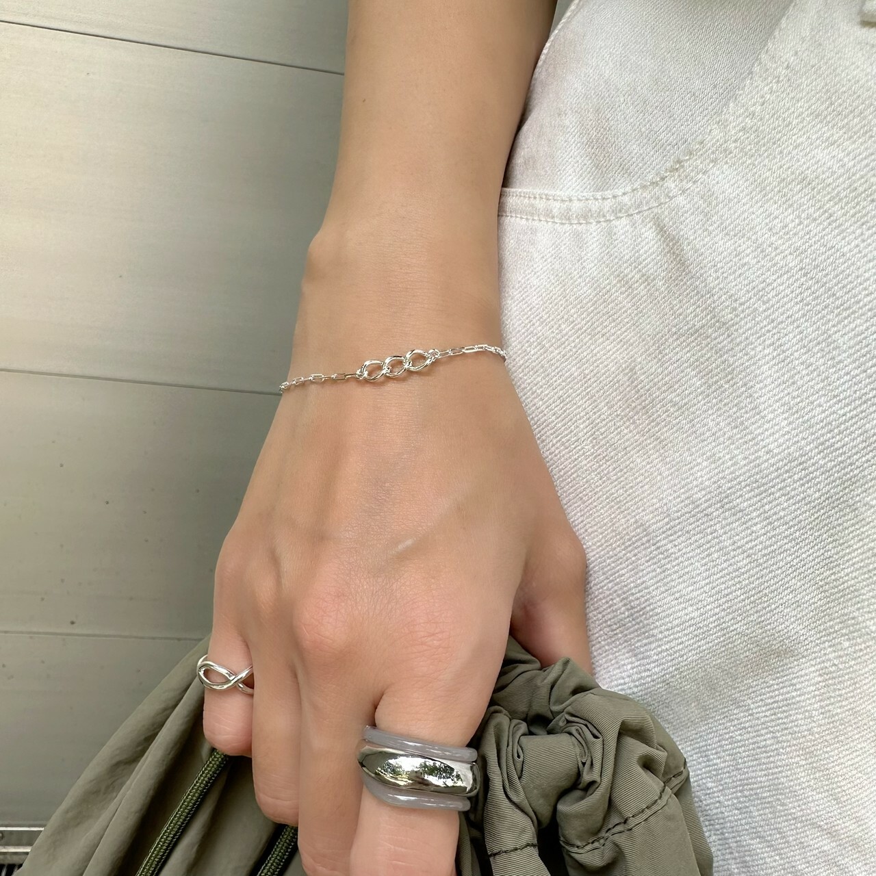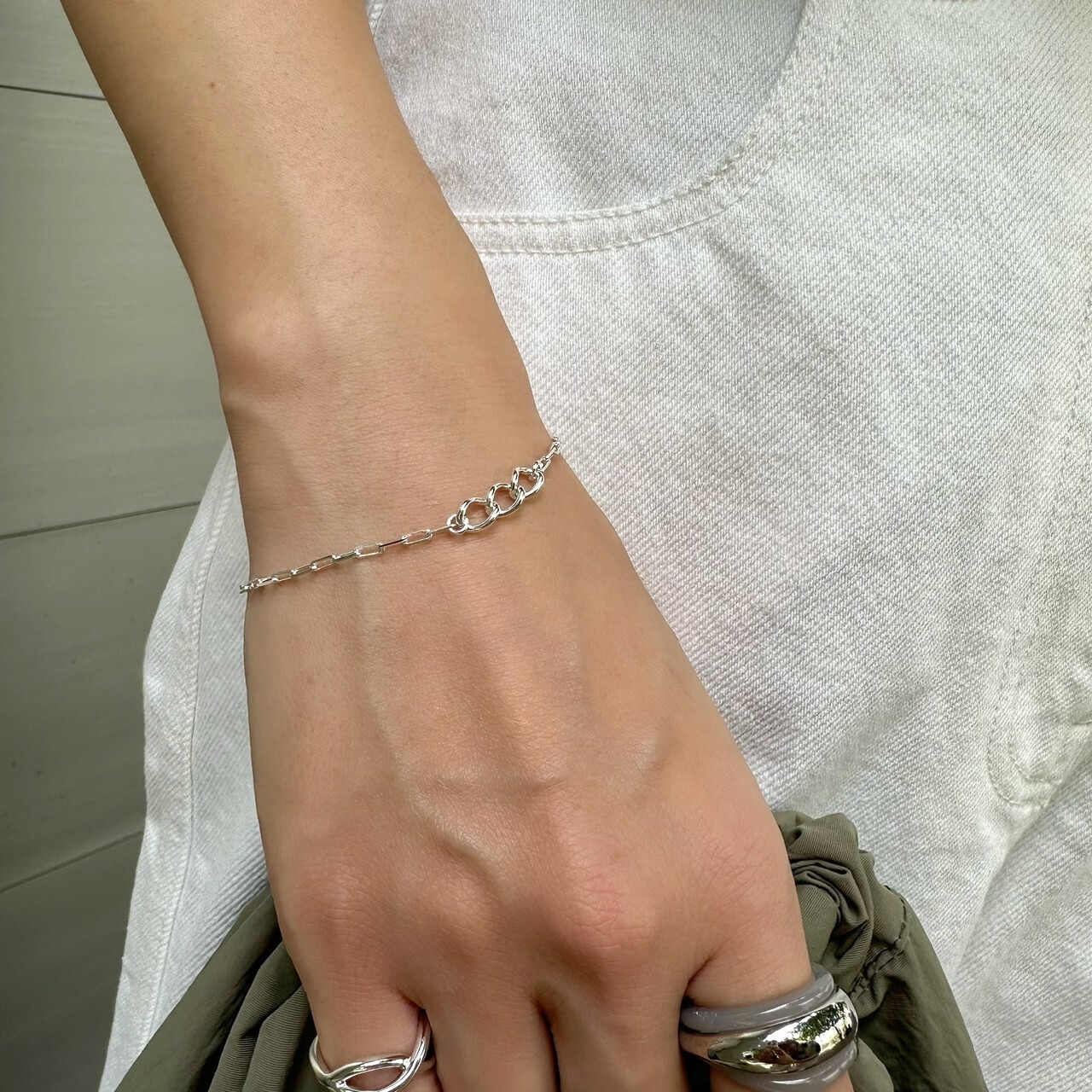 フォルムの違う2種類のチェーンがエッジを効かせ、シンプルの中に程よくアクセントをプラスします。